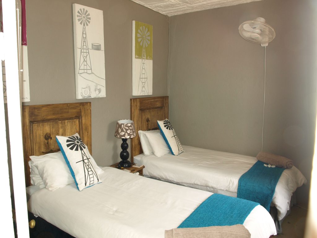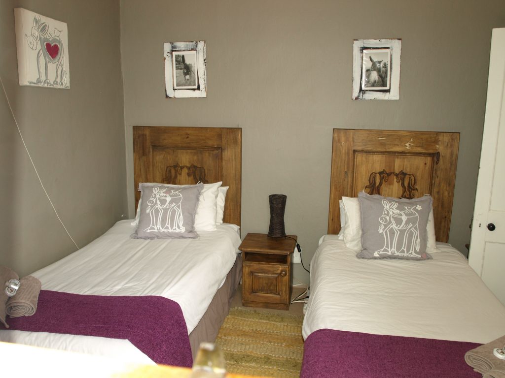 This unit comprises of the Bird, Donkey & Windmill Rooms. The original farmhouse that has been authentically renovated, offering three twin rooms with single beds; two bathrooms one with a shower and one with a bath; including a dollhouse-like kitchen connected to a small living room with a fireplace and extending onto a shady veranda with beautiful mountain views. Linen and towels for all rooms, as well as wood, is provided.
